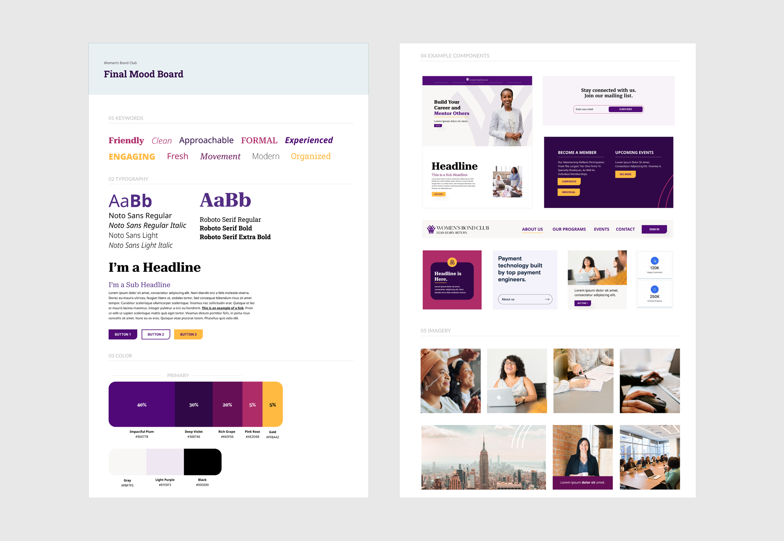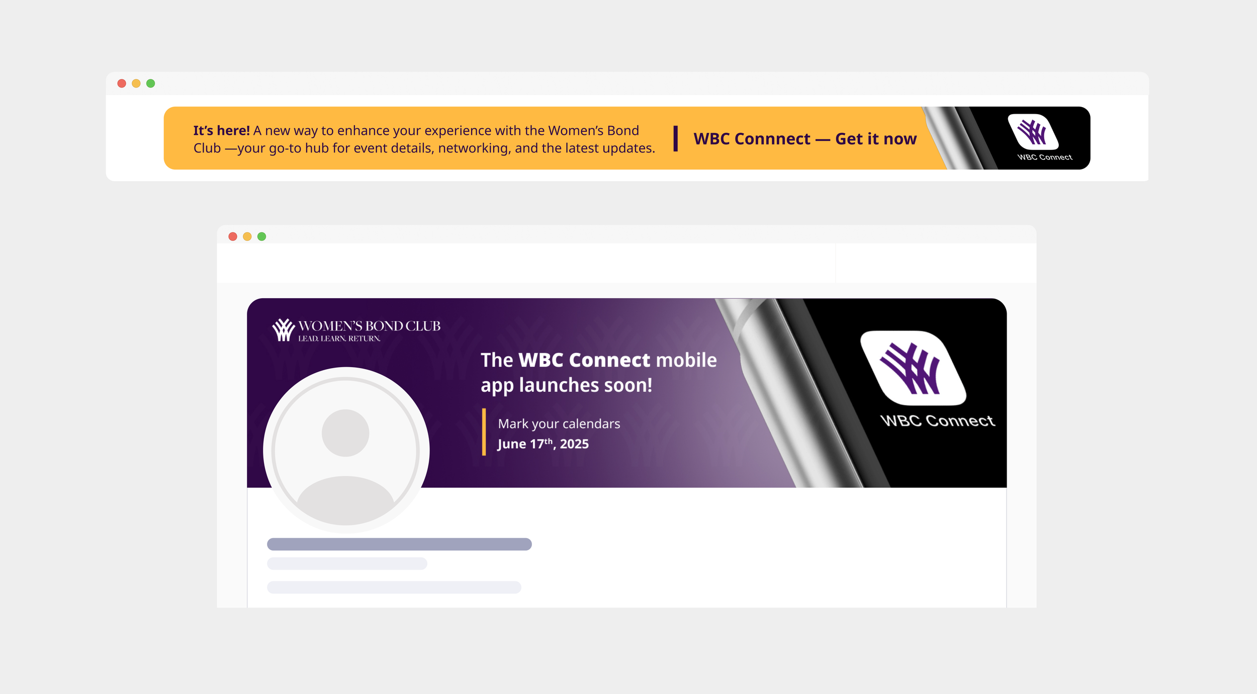 Women’s Bond Club needed a refreshed visual approach to support a community-centered initiative focused on connection and engagement. The challenge was updating both the brand and website within the constraints of a limited CMS platform (iMIS), while ensuring the design remained approachable, inclusive, and cohesive across multiple digital and promotional touch points. After the website refresh, the next project was to introduce WBC Connect, a third party app where users could join and interact.