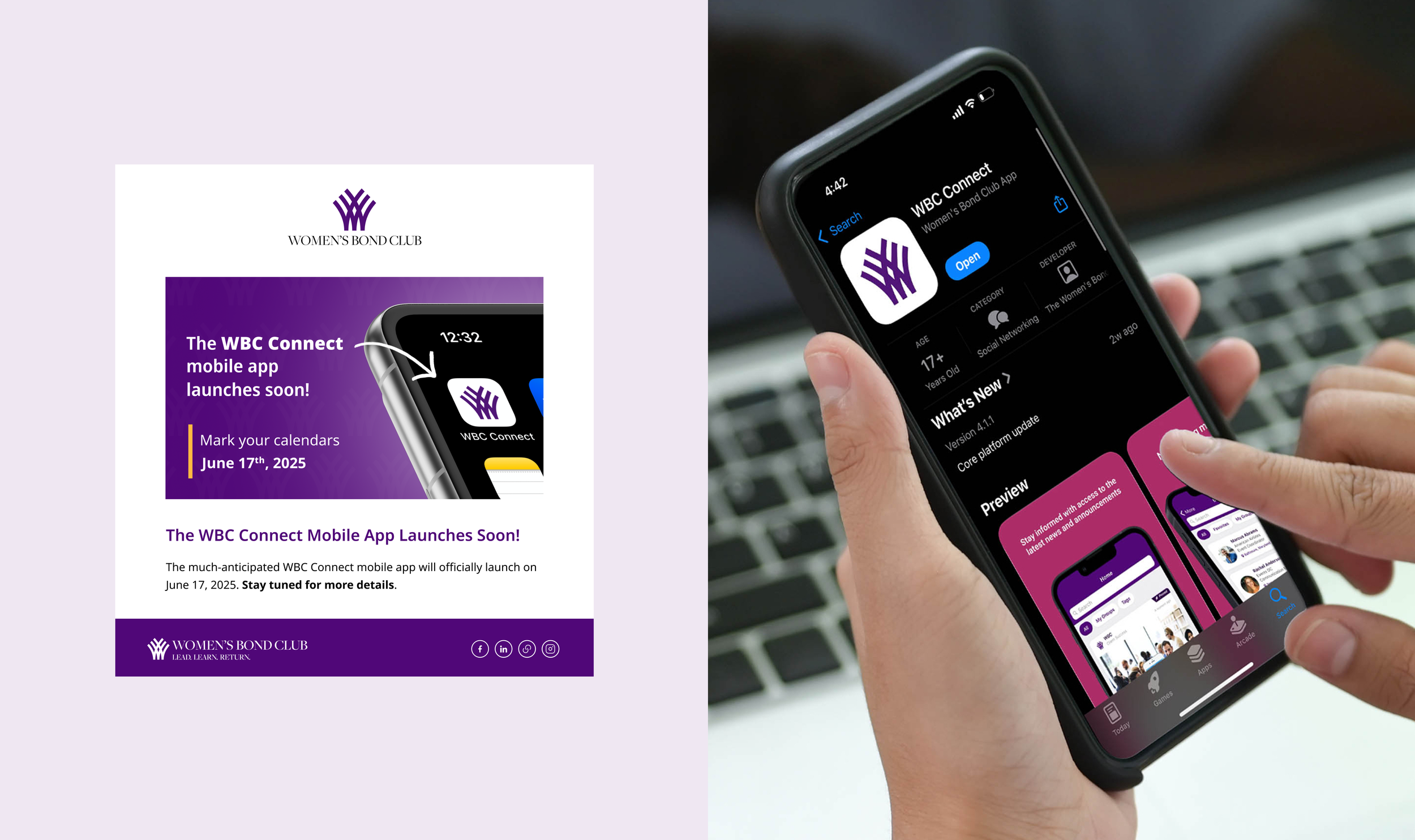 I designed a new look and feel for the brand, which then included a website refresh along with campaign and digital assets that helped bring the Women’s Bond Club identity to life across multiple touch points. My work focused on creating a cohesive visual system that balanced clarity, consistency, and a more approachable, community-driven tone. After the website launch, my next role was to help with both promotion and implementation of WBC Connect.
